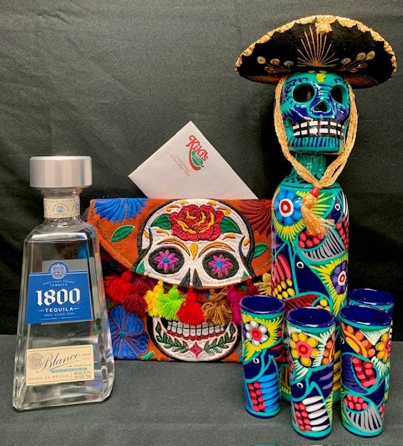 Beautiful handmade tequila decanter set, complete with a bottle of 1800 ready to pour. Salud! Also includes a $25 gift certificate to Kiki's Restuarant.
